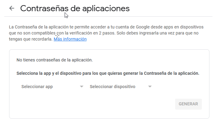 Ya teniendo la Autentificación de 2 pasos activado podremos generar una contraseña de aplicación. Una contraseña de aplicación es una contraseña de 16 dígitos que concede permiso a una aplicación o a un dispositivo menos seguros para acceder a tu cuenta de Google actualmente FACTO no soporta otro medio integrar Google. Estas contraseñas solo se generan una sola vez y en caso de perderla o escribirla erróneamente se debe generar una nueva las veces que sea necesario.