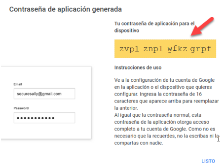 Aparecer una ventana en la cual en el recuadro amarillo nos dará nuestra contraseña de aplicación la cual tenemos que copiar, en el caso de ingresarla a FACTO, no se deben considerar los espacio y escribirla completa.