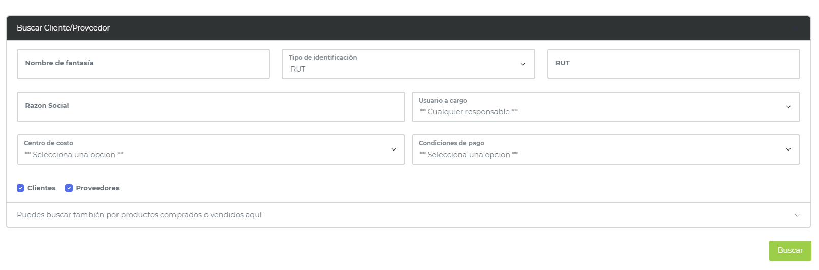 Para realizar la búsqueda de algún cliente o proveedor, accedemos a la opción del menú Clientes/Proveedores -> Buscar Clientes/Proveedores.
