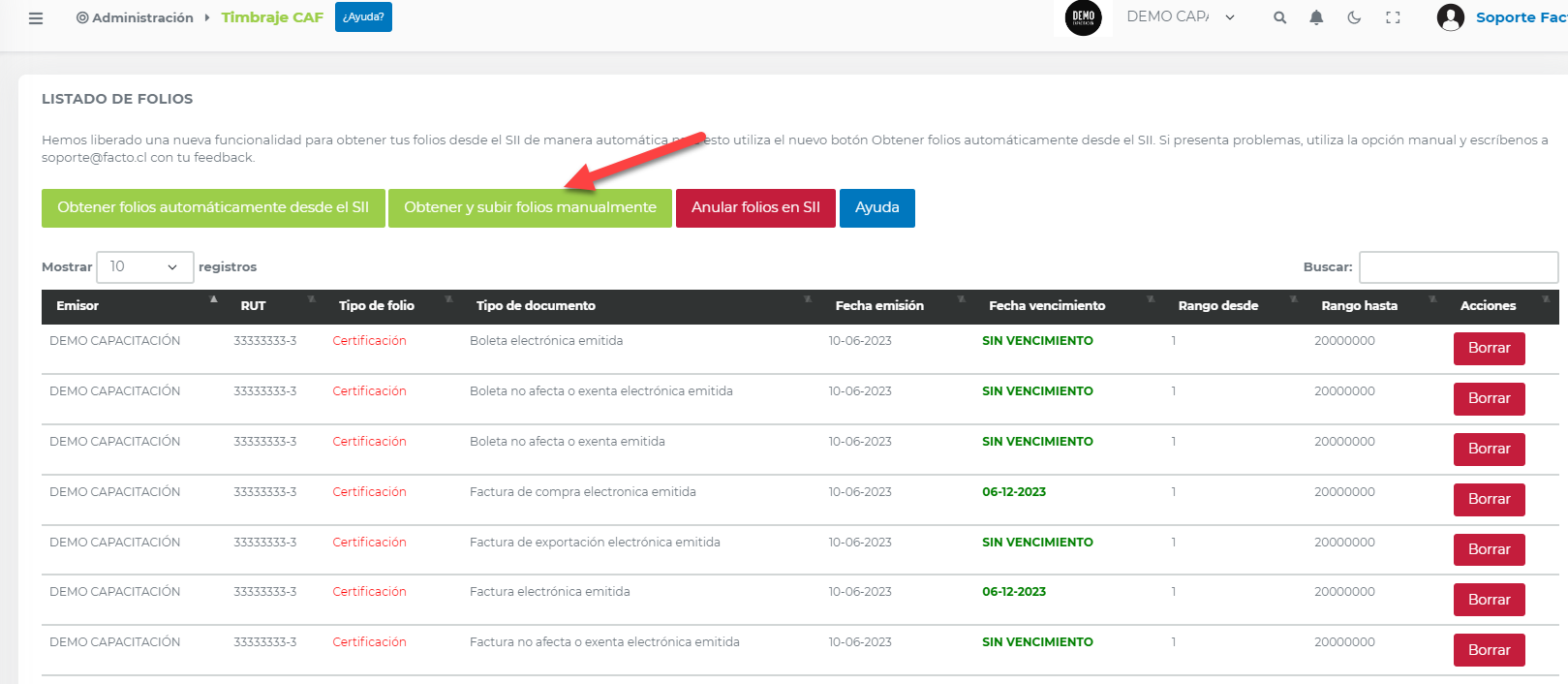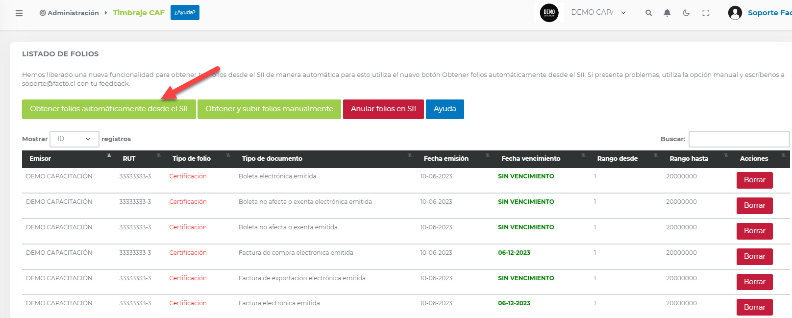 Para solicitar folios debes dirigirte al módulo Administración >> Timbraje CAF, puedes solicitar folios de dos maneras, la primera es de forma automática desde Facto con el botón "Obtener folios automáticamente desde el SII", debes hacer click en el siguiente botón: