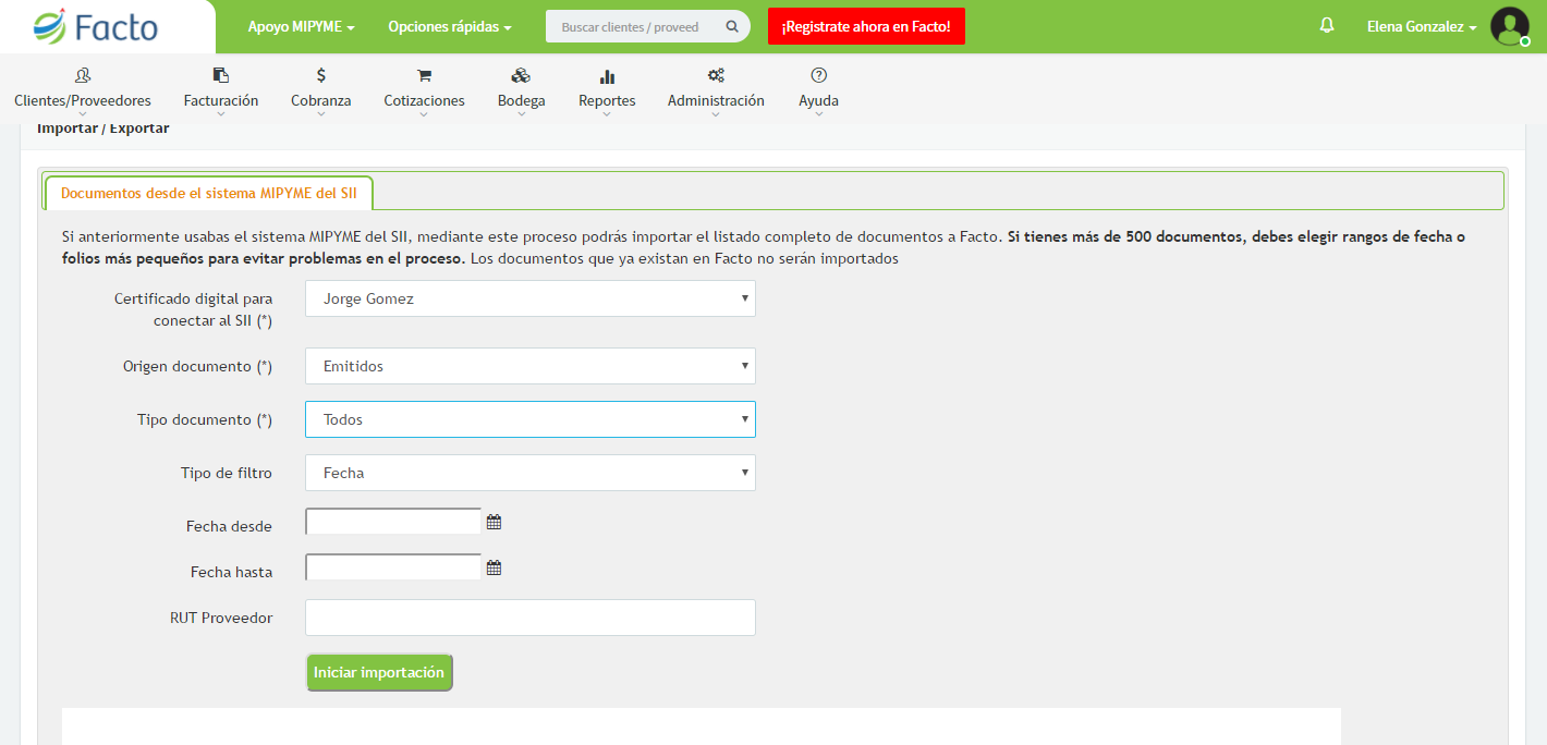 En Administración >> Importar/Exportar debes respaldar documentos emitidos desde el SII en Facto. Este proceso toma un par de minutos dependiendo de la cantidad de documentos a respaldar, con un máximo de 500. Nota: debes cargar solo los XML de los documentos emitidos y recibidos. No se deben cargar XML de libros contables