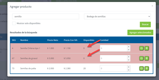 Aunque no tenga stock disponible igual se pueden agregar a la cotización, pero posteriormente si queremos emitir una factura u otro documento a partir de esta cotización debemos aumentar el stock del producto antes, o sino no podremos emitir el documento. O bien podemos configurar en el modulo de Administración -> Datos de la empresa si queremos o no queremos emitir documentos a pesar de no tener stock disponible: