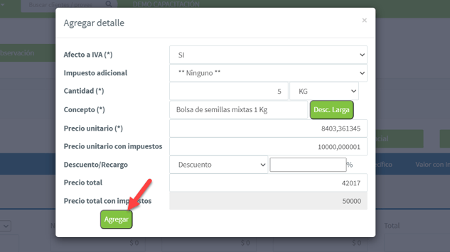 Esta opción la utilizamos, si queremos agregar a la cotización un producto o servicio que no ha sido creado en bodega, para ello completamos los datos requeridos, y presionamos el botón Agregar: