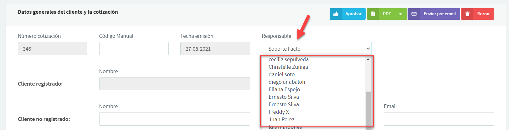 En el campo Responsable aparecerá por defecto el usuario que etsá creando la cotización, pero también se puede seleccionar el responsable de forma manual: