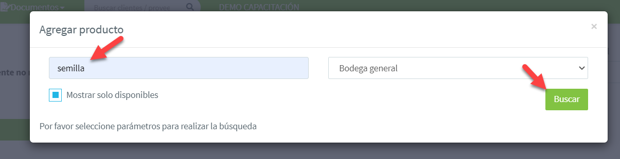Debemos ingresar el nombre, SKU o código de barras del producto para buscar: