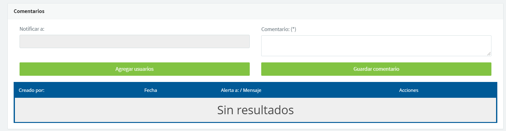 Por último, al final de la ventana de cotización, existe una opción de comentarios, donde se mostrarán los comentarios realizados para uso interno, y un registro de los mensajes enviados al cliente desde el sistema, podemos agregar más usuarios también para que sean notificados y vean los comentarios: