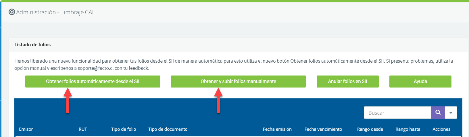 Para emitir una nota de crédito electrónica primero que nada debes solicitar folios para ese tipo de documento en el módulo Administración >> Timbraje CAF, puedes solicitar los folios de forma automática desde Facto con el botón "Obtener folios automáticamente desde el SII", en caso de que no se pueda desde Facto (puede suceder en caso de que tengas situaciones pendientes con SII u otros motivos), puedes solicitar los folios desde la página del SII y cargarlos de forma manual a Facto con el botón "Obtener y subir folios manualmente":
