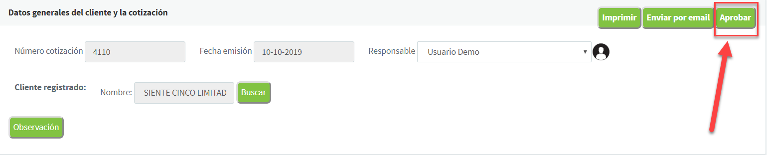 La ventana de una cotización, cuenta con un botón que se llama Aprobar: