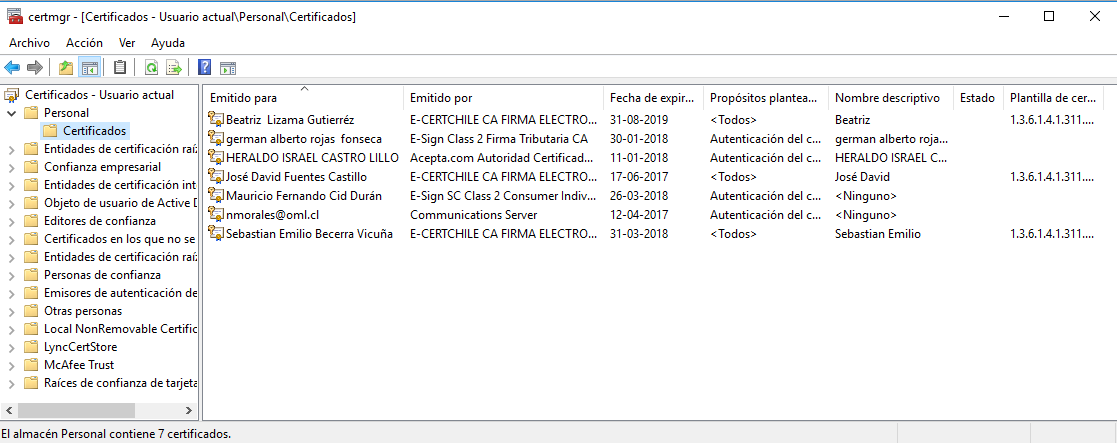3) En esta ventana, acceda a los certificados de tipo "Personal" y luego a la carpeta "Certificados dentro de esta, con ello se mostrarán los certificados digitales que dispone instalados en su computador: