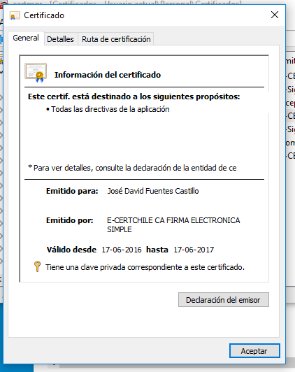4) Dentro de estos seleccione el que quiera exportar y haga doble click sobre este, con esto se abrirá la información del certificado:
