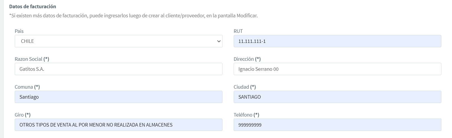 Luego ingresas los datos de facturación correspondientes del cliente/proveedor:
