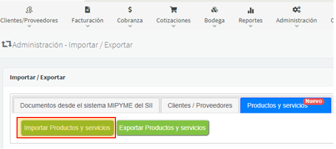 2. Seleccionando la pestaña Productos y Servicios y presionando el botón