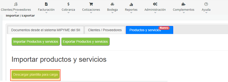 - Seleccionar archivo correspondiente a la plantilla con los datos de productos y servicios deseados