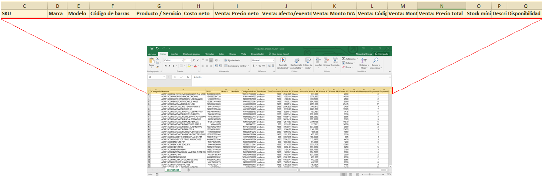 4. Abriendo la plantilla descargada en formato EXCEL con los datos correspondientes de cada artículo y sus atributos correspondientes (descripción, código, precio, costo, cantidad...). Cabe mencionar que no es necesario llenar todos los campos obligatoriamente, sino únicamente aquellos que se consideren necesarios conforme los criterios de funcionamiento de cada empresa