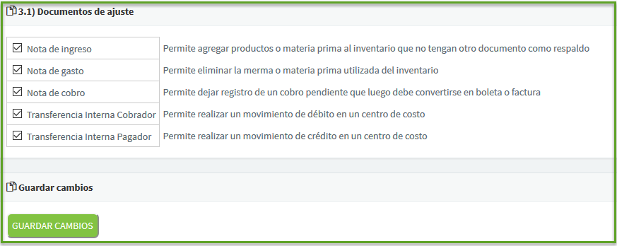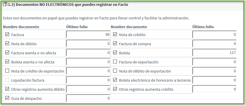 En la opción Administración -> Tipos de documentos, es posible habilitar o deshabilitar el uso de ciertos documentos tributarios, para cada uno se marca o desmarca la casilla correspondiente, y al finalizar, se presiona el boton "GUARDAR CAMBIOS", ubicado al final de la página, para aquellos documentos de ventas, también está la opción de editar el último folio emitido, cosa que los próximos documentos emitidos puedan tener la numeración del folio de forma automática.