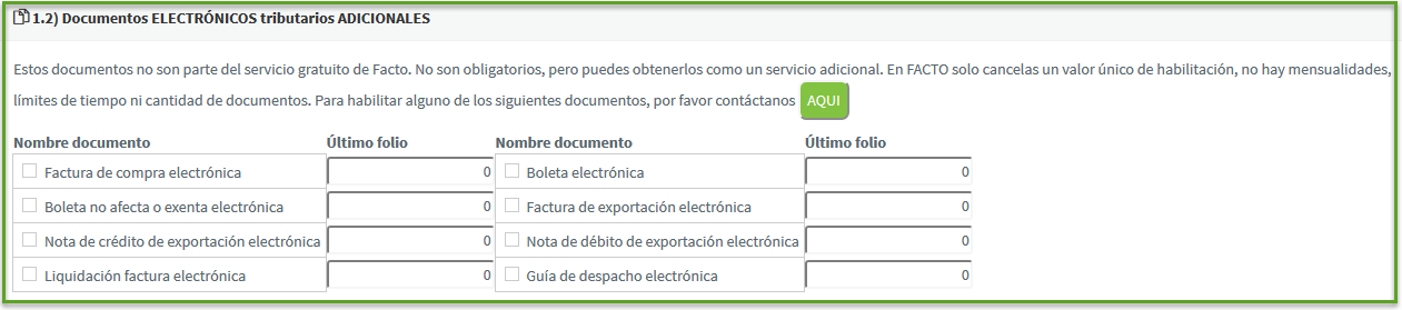 Luego aquellos documentos tributarios electrónicos adicionales, que para ser utilizados en Facto, deben ser contratados como servicio adicional (corresponde a un costo único de habilitación, no se pagan mensualidades, ni hay límite de tiempo o documentos en este caso):