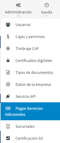El pago por el uso de servicio API u otros servicios adicionales, puedes realizarlo ingresando como administrador a Facto, en la opción Administración >> Pagos servicios adicionales.
