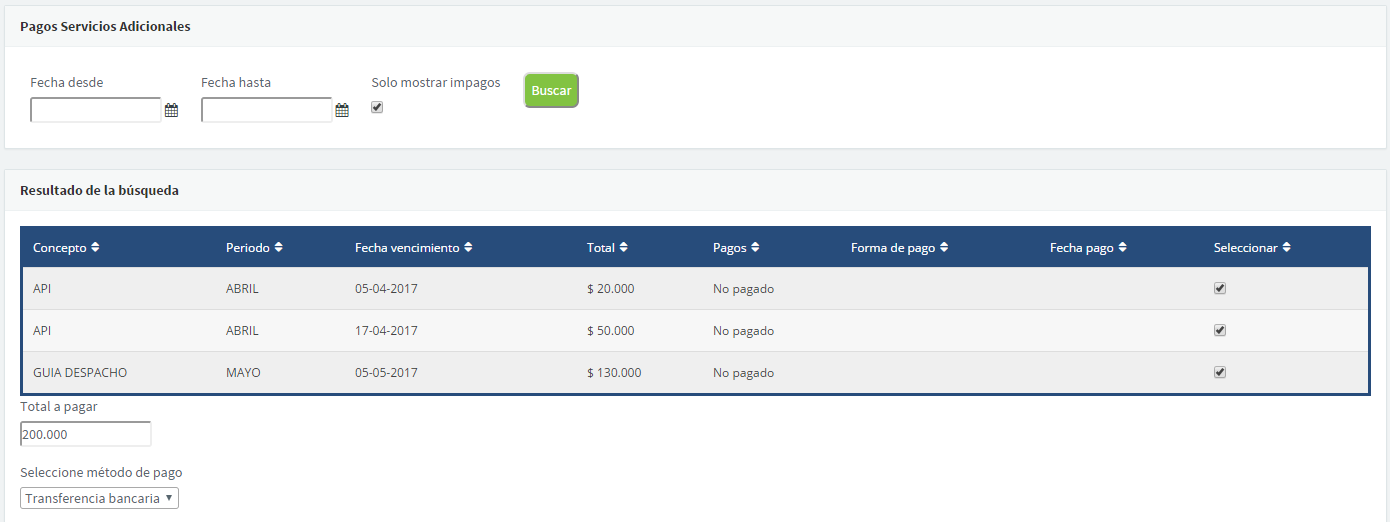 Selecciona los servicios que vas a pagar y la forma de pago a realizar y presiona "Pagar".