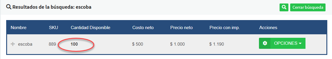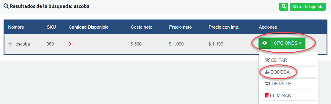 Ya cuando aparezca el producto que estás buscando, vas a hacer click en OPCIONES, seguido de BODEGA: