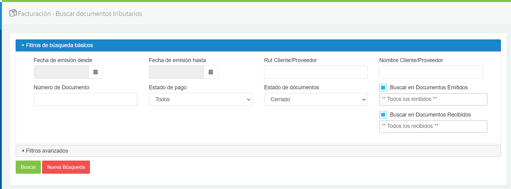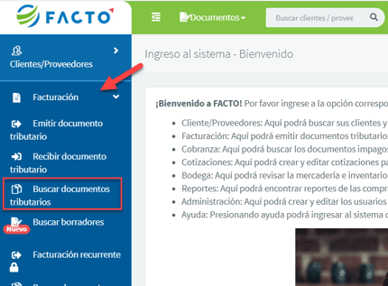Para buscar un documento tributario debes dirigirte al módulo Facturación >> Buscar documentos tributarios: