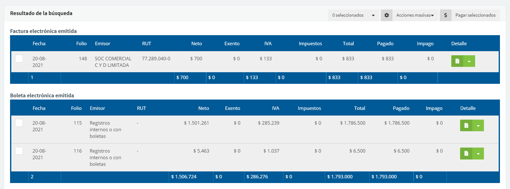 Ejemplo, en este caso se realizará una búsqueda de los documentos emitidos entre el 19-08-2021 al 21-08-2021, seleccionando sólo los documentos recibidos, específicamente, factura electrónica y boleta electrónica: