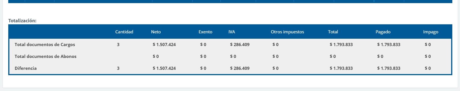 Y en la parte inferior, debajo de los documentos, aparece la totalización de estos: