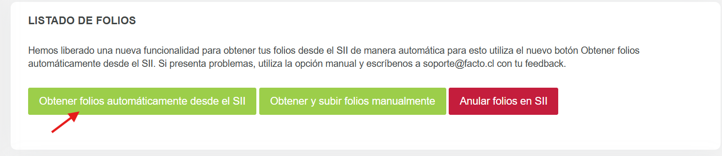 1.-Para cargar Folios directamente desde SII debes hacer click en el botón "Obtener folios automáticamente desde el SII", este botón te permite solicitar folios desde Facto