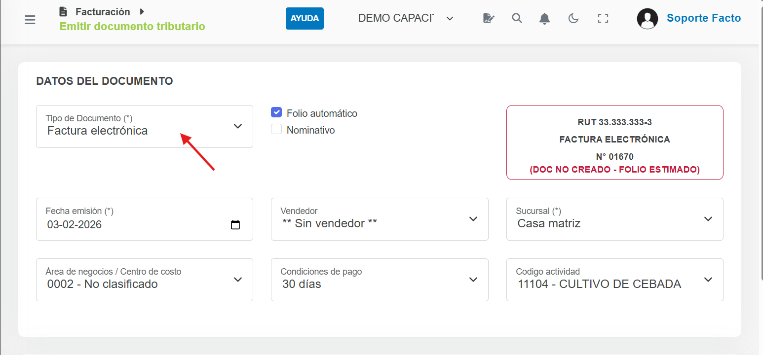 Bien, ya habiendo solicitado los folios, deberás dirigirte al módulo Facturación >> Emitir documento tributario, en "Tipo de documento" debes seleccionar el documento que vas a emitir, por ejemplo "Factura electrónica":