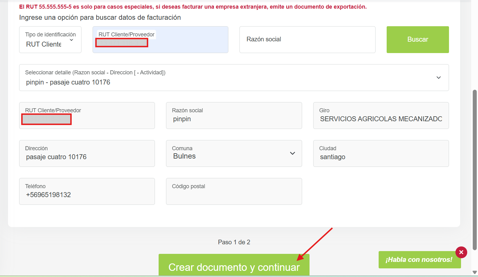 El segundo paso es llenar los datos del receptor, basta con que ingreses el rut del cliente, los datos se llenaran de forma automática, luego de que los datos se carguen haces click en "Crear documento y continuar":