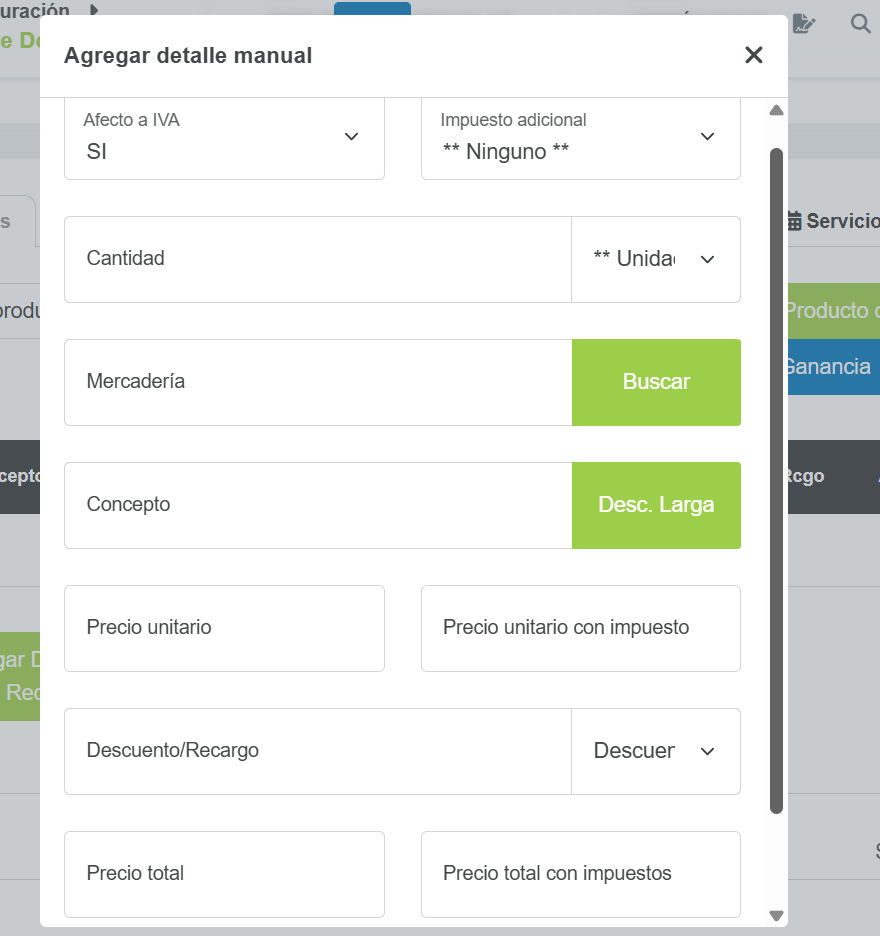 Para agregarlos de forma manual debes hacer click en el botón "Agregar detalle manual", luego sólo debes llenar los campos correspondientes y hacer click en "Agregar":
