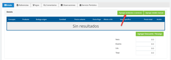 Para agregar un producto ya creado debes hacer click en "Agregar producto o servicio":