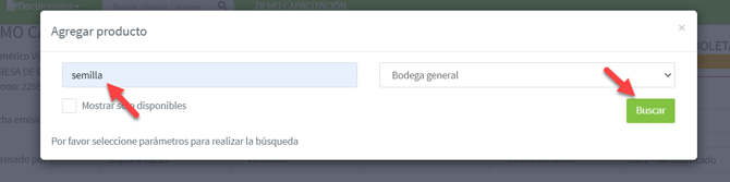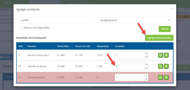 Te aparecerán los productos o servicios de acuerdo a la búsqueda, deberás indicar la cantidad que quieres agregar y luego haces click en "Agregar seleccionados":