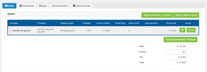 Luego, debes agregar el detalle, el cual corresponde a los productos o servicios, estos los puedes agregar de forma manual en caso de no tener productos creados en Facto o de forma automática de tener ya productos creados en Facto.