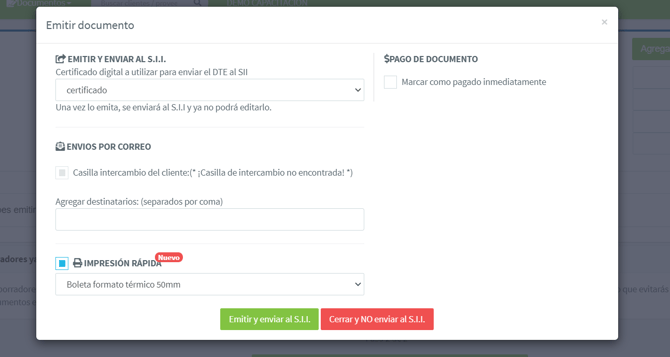 Te aparecerá un cuadro como el siguiente, donde podrás seleccionar si quieres emitir el documento y enviar al SII o sólo emitir el documento sin enviar al SII, si necesitas que el documento sea enviado al SII debes hacer click en la primera opción: