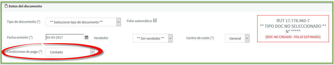 Al emitir una boleta o factura por Facto seguramente se puede ver que en la opción Condiciones de pago que sale al inicio solo se refiere a los plazos (dice contado, 15 días, 30 días, etc., es la que se muestra en la imagen), eso se refiere a que al emitir el documento solo se fijan cuantos pagos habrían y en qué fecha vencen estos pagos, pero no por qué medio se efectuaron (si fue en efectivo, cheque, tarjeta, o algún otro).