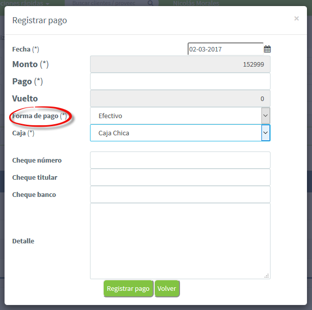 Con esto se abre una ventana como la siguiente, donde en la opción "Forma de pago" se ingresa la forma de pago utilizada, justo abajo de esta está la opción para seleccionar la caja donde se registrará el pago, una buena práctica es tener separadas las cajas que reciben efectivo, de las que reciben pago por tarjeta y también de las que reciben las transferencias (para crear nuevas cajas, esto se hace en Administración -> Cajas y Permisos):