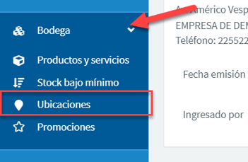 Puedes visualizar las Bodegas en el módulo Bodega >> Ubicaciones, donde podrás crear bodegas, visualizar los productos asignados a estas bodegas, o cambiar el nombre de una bodega: