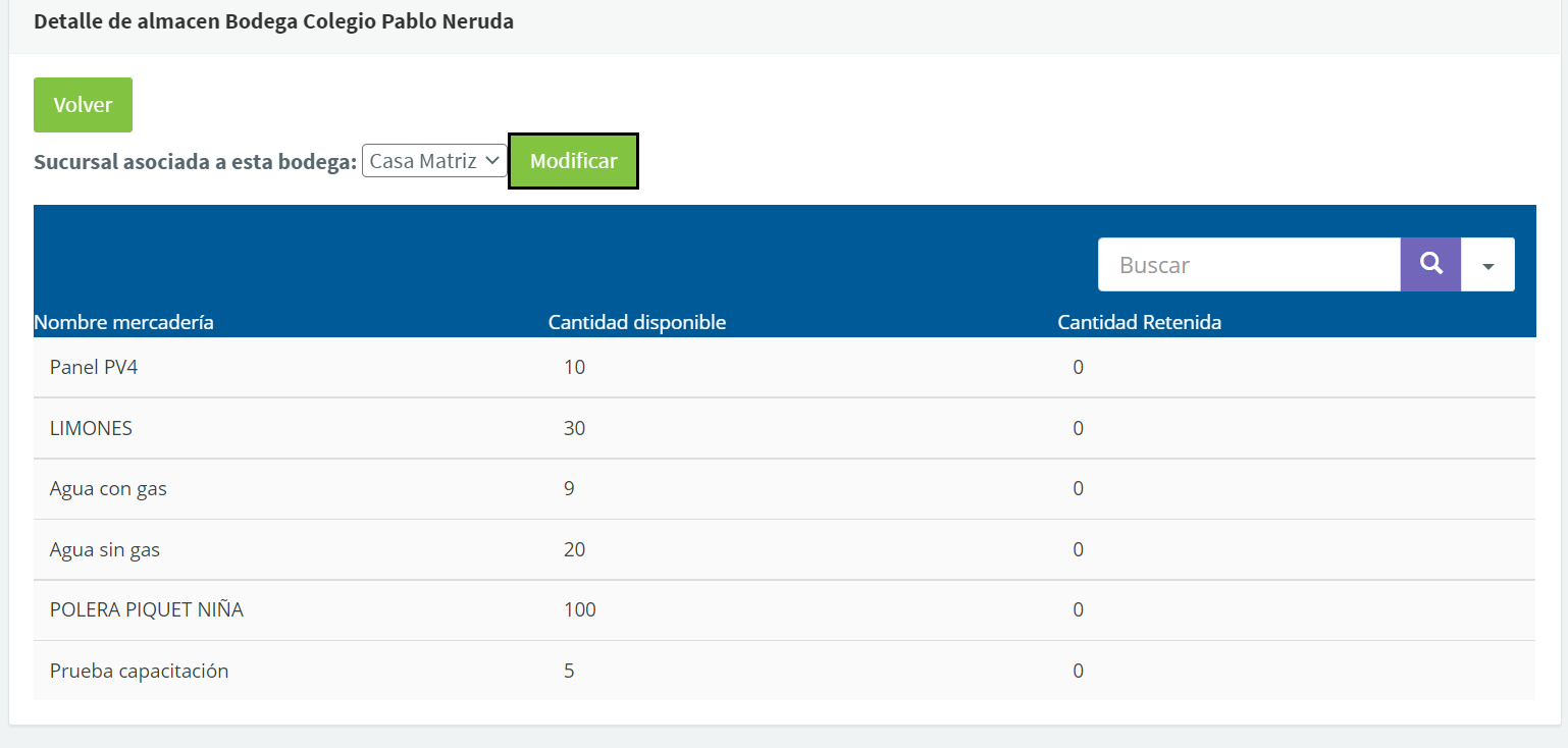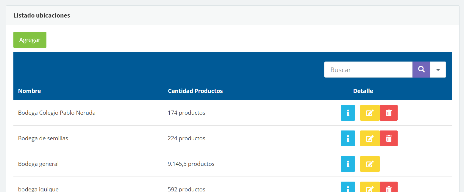 Puedes ver los productos asignados a cada bodega en el ícono azúl: