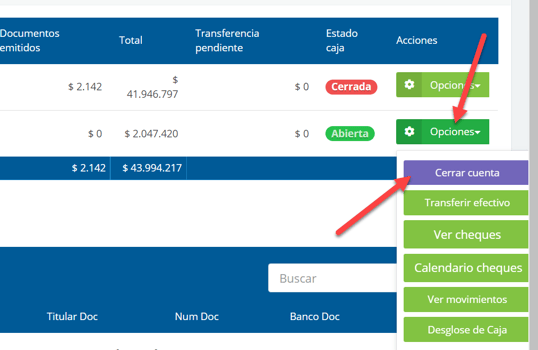 - Para cerrar la caja es el mismo procedimiento, haces click en "Opciones >> Cerrar cuenta":