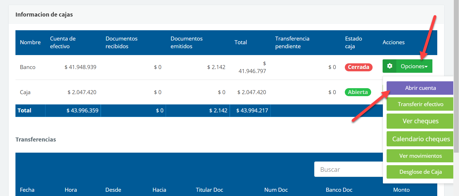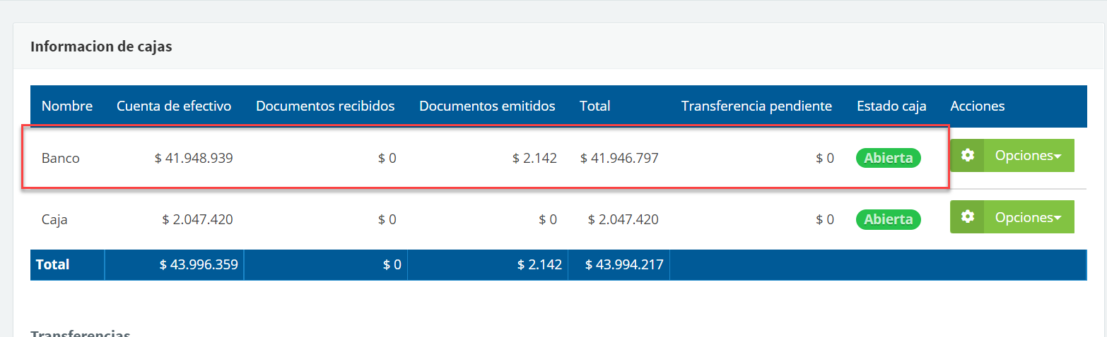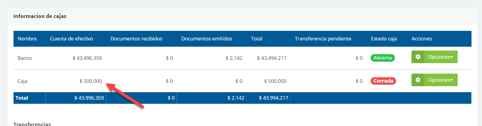 Luego de hacer la transferencia "Caja" quedará con un monto menor, el que se necesita para hacer apertura: