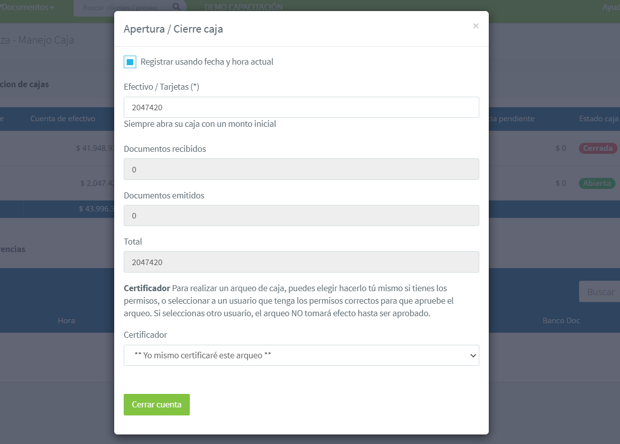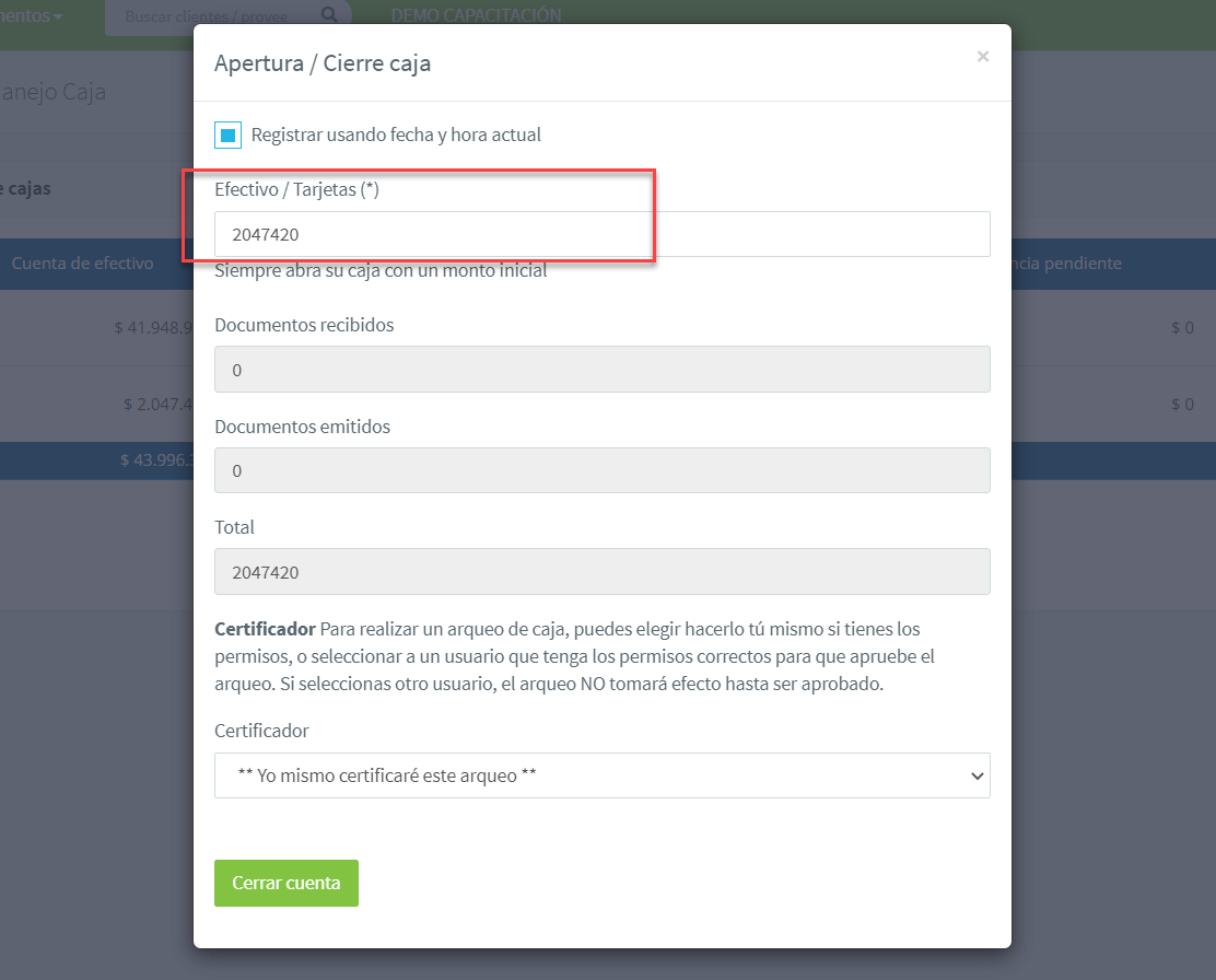 Confirmas que el monto de "Efectivo/Tarjeras" coincida con "Cuenta de efectivo" y procedes a cerrar la caja: