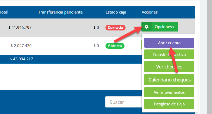 En el caso que, por ejemplo, se necesite abrir la caja "Caja" con un monto menor al que hay en "Cuenta de efectivo", lo que se debe hacer es: