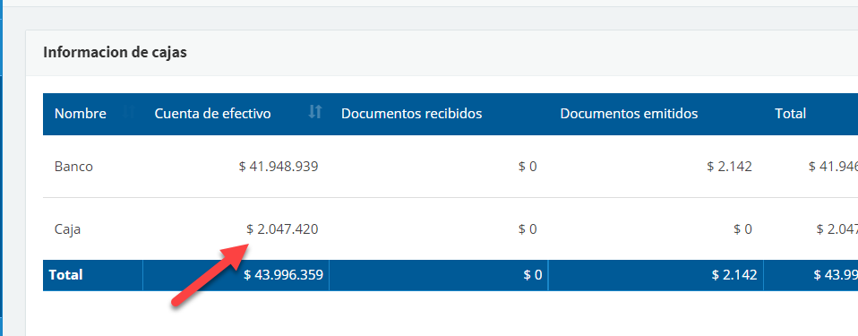 Donde en el campo "Efectivo/Tarjetas" aparecerá el monto de la columna "Cuenta de efectivo":