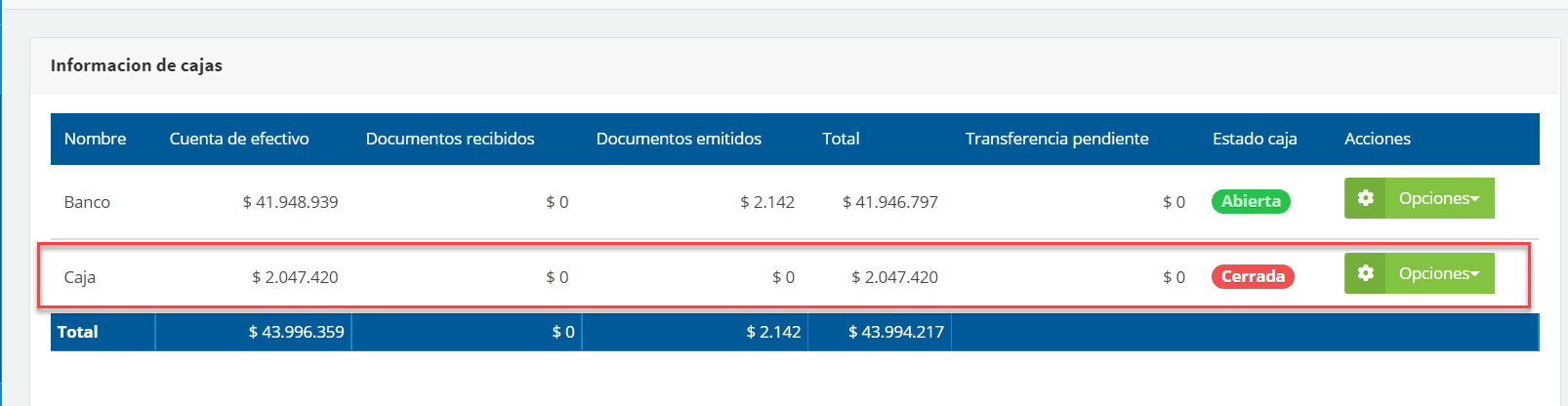 En este ejemplo la caja "Banco" está cerrada, y la caja "Caja" está abierta.