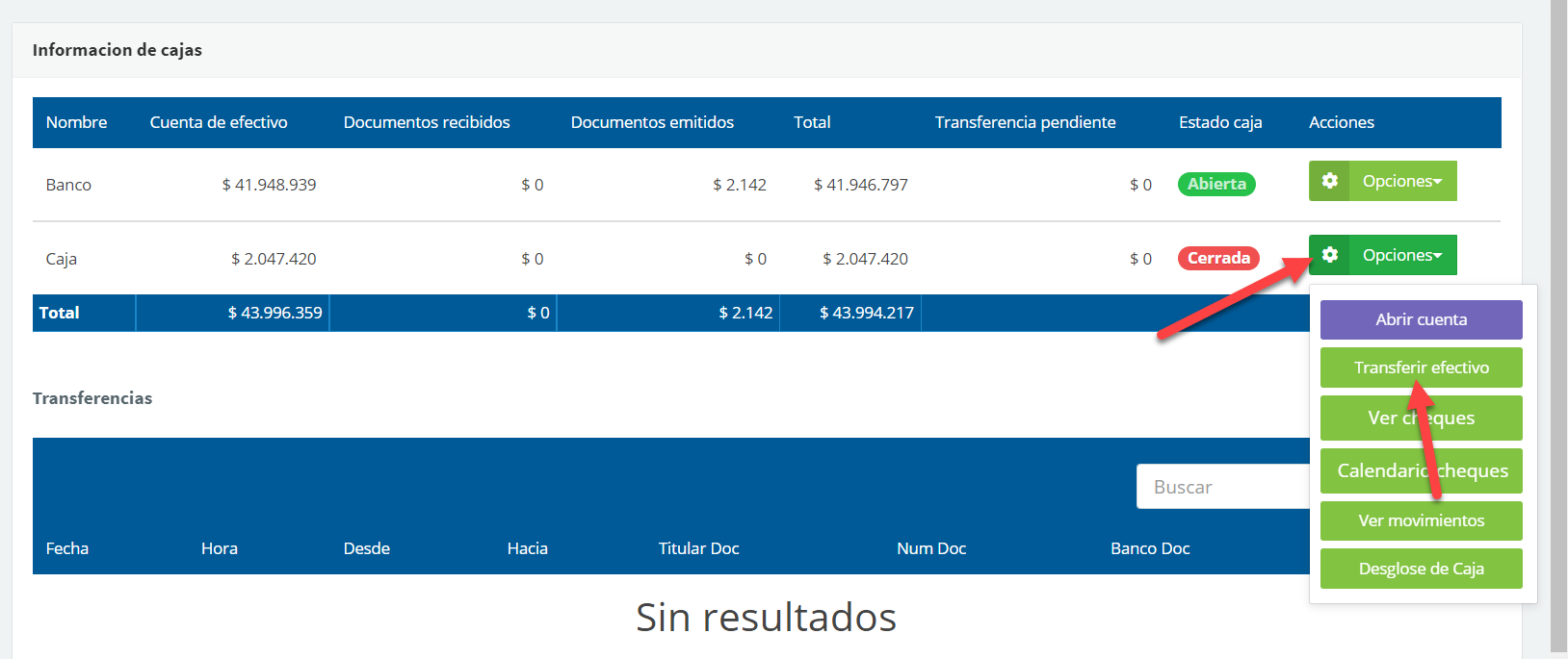 a) Transferir el efectivo de "Caja" hacia "Banco" (en este caso es hacia Banco ya que es la única caja disponible además de "Caja", pero siempre se pueden crear más cajas):