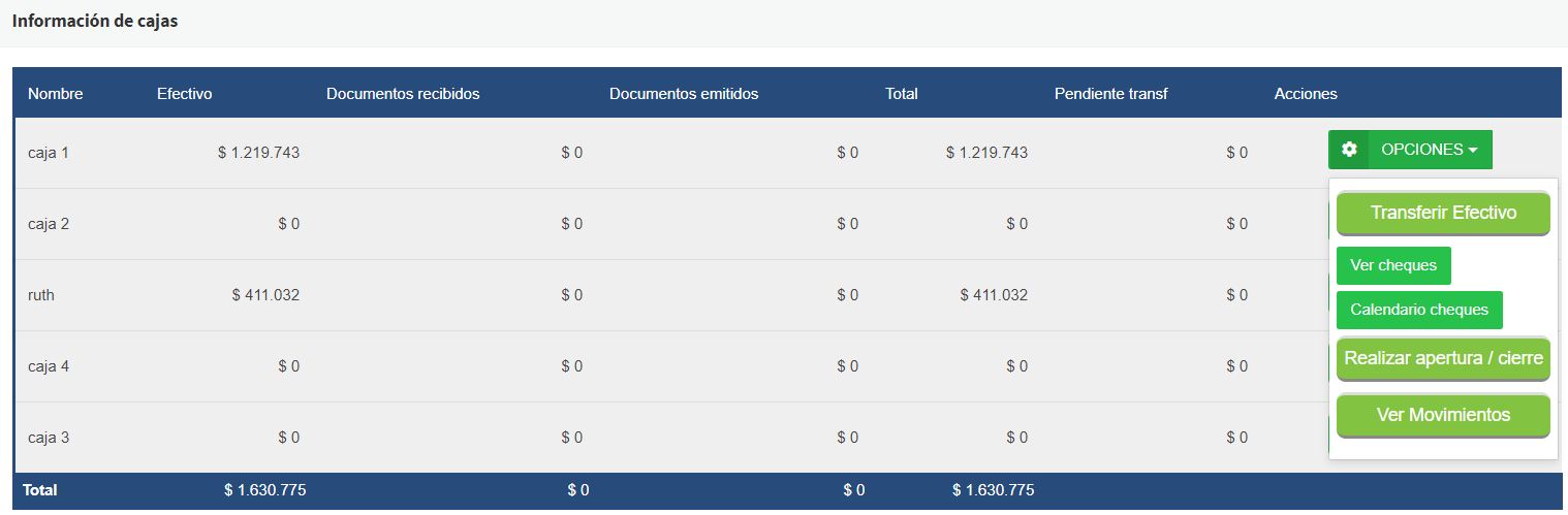 Para transferir dinero entre cajas, vamos al modulo Cobranza -> Manejo Caja, en esta nos aparecerá una lista con las cajas creadas, desde la que deseemos transferir dinero debemos oprimir el botón OPCIONES -> Transferir Efectivo: