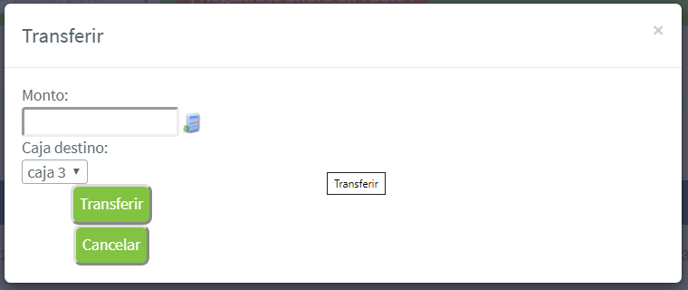 Note que hay un botón con forma de calculadora al lado del campo de monto, si se escribe una expresión matemática en esta, por ejemplo "45000+1600+2300" o "2750*18", y luego presiona la calculadora, se calculará el monto total de esta expresión (si ingresa caracteres inválidos en esto, como letras por ejemplo, la operación transferirá un monto de $0, notar que esto incluye si se intenta usar la letra x para multiplicar, la multiplicación es con el carácter *). No se verifica que las transferencias sean menores que el total de la caja, si usted transfiere más dinero, la caja quedará con saldo negativo.