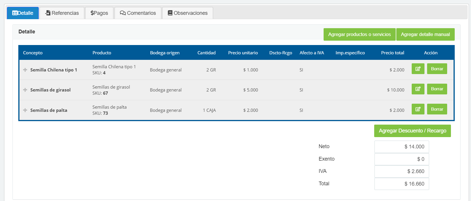 Al emitir un documento tributario de venta (Facturas electrónicas, Boletas electrónicas, etc.) o un documento de uso interno, como el Registro interno disminuye stock, tendremos que manejar la asignación de stock en el detalle del documento, para eso usaremos el botón de Agregar producto o servicio, a medida que vamos agregando detalle al documento, se verá una lista como la siguiente: