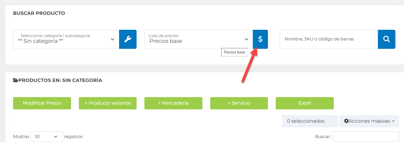 Para crear una lista de precios hay que dirigirse al módulo Bodega >> Productos y servicios, dentro de este módulo se hace click en el siguiente botón: