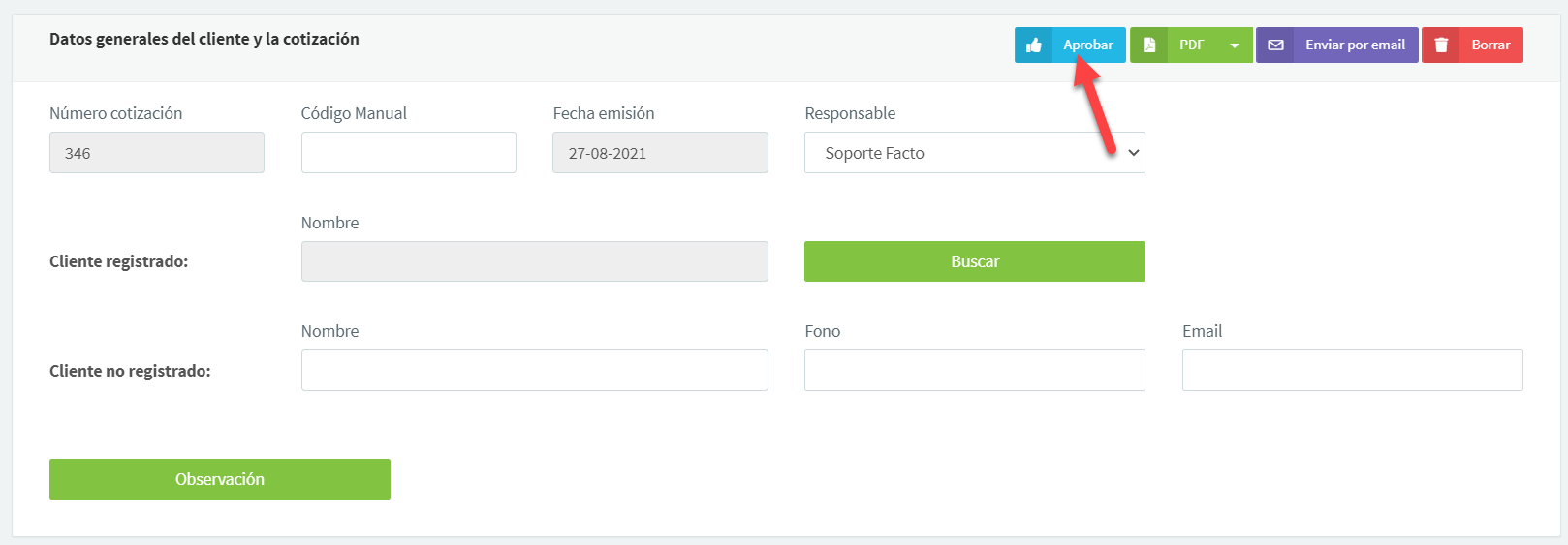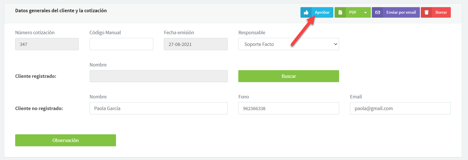 Ahora que el usuario tiene permiso para aprobar cotizaciones, podrá realizar esa acción.